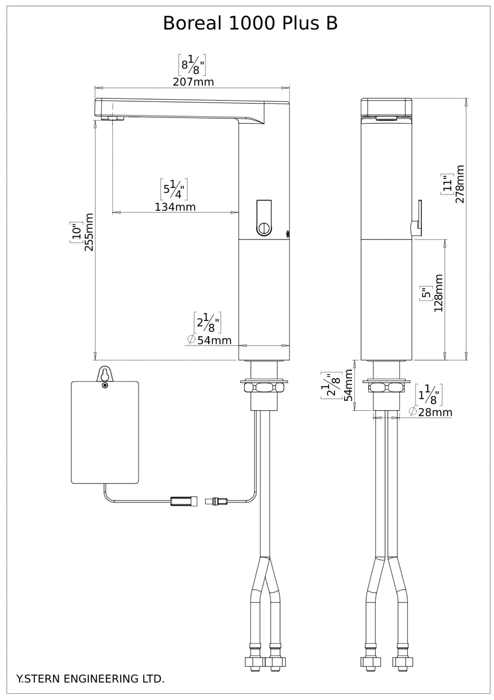 Touch-free electronic faucet for deck-mounted installations. Activated by concealed sensor built into the spout. Solid brass one-piece construction. For cold or premixed water. Filter included. Latching solenoid valve mounted inside the faucet body. Sensor includes a low battery indicator. Adjustable settings by remote control: